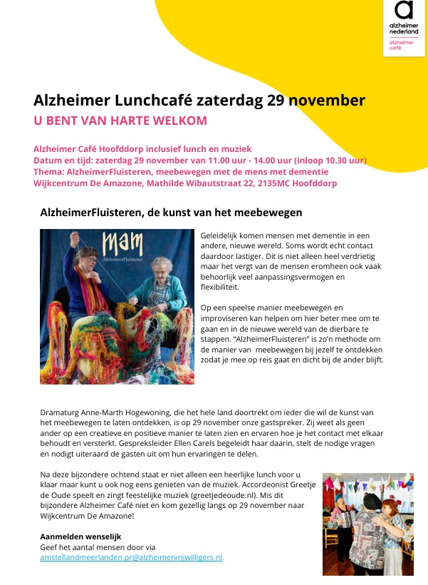 29 november: Alzheimer Café Hoofddorp : Lunch Café: “Alzheimer Fluisteren, de kunst van het meebewegen”- inclusief lunch en muziek